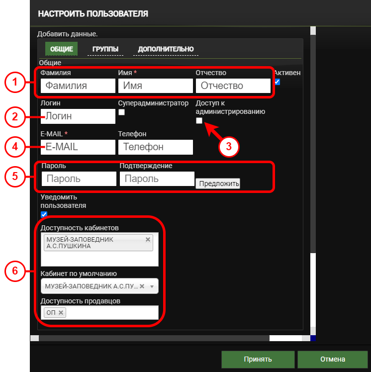 Заполните поля Пароль, Подтверждение - поля ввода пароля который будет установлен для пользователя