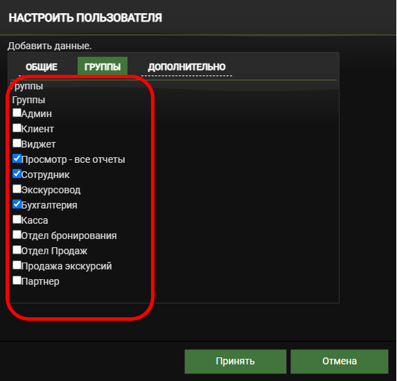 Выберите группы (элементы системы) к которым пользователь будет иметь доступ