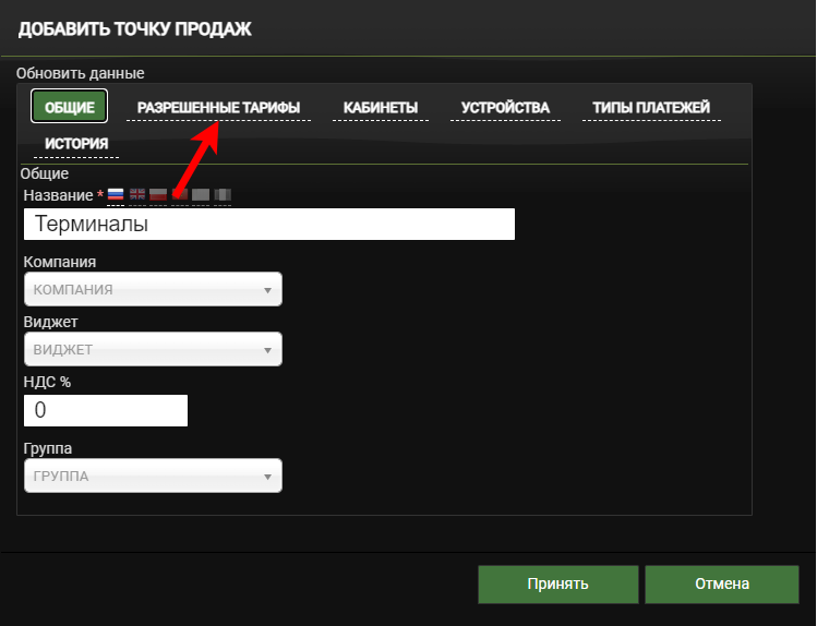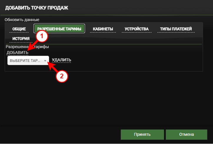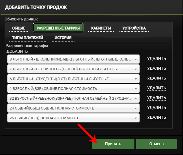 ИнформацияЕсли на вкладке Разрешенные тарифы не выбраны тарифы, то для точки продаж будут доступны все тарифы.