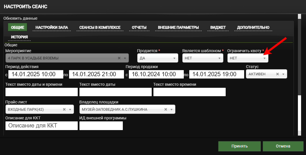 - Изменение квоты позволяет изменить точки продажи билетов в рамках одного сеанса. Такие изменения не оказывают влияние на другие события.