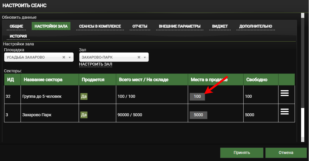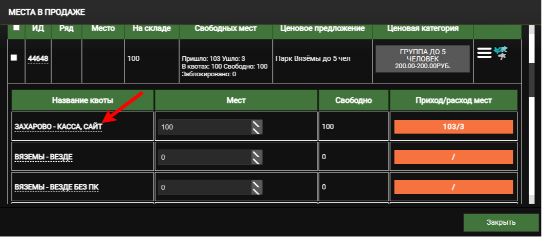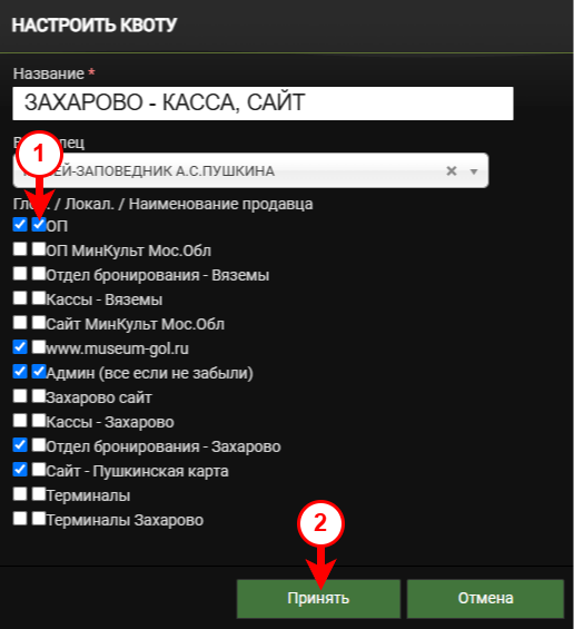 Билетная система позволяет переопределять списки точек продаж (Квоты) в рамках сеанса события.