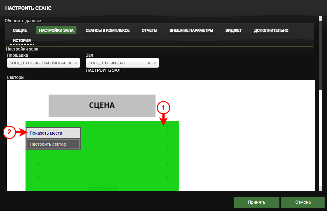 Закройте окно Места в продаже и нажмите Принять в окне Настроить сеанс