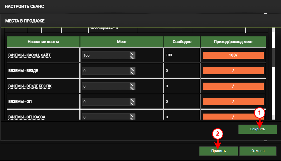 - Изменение квоты для одного места в сеанса, автоматически меняет квоты для других мест в сеансе