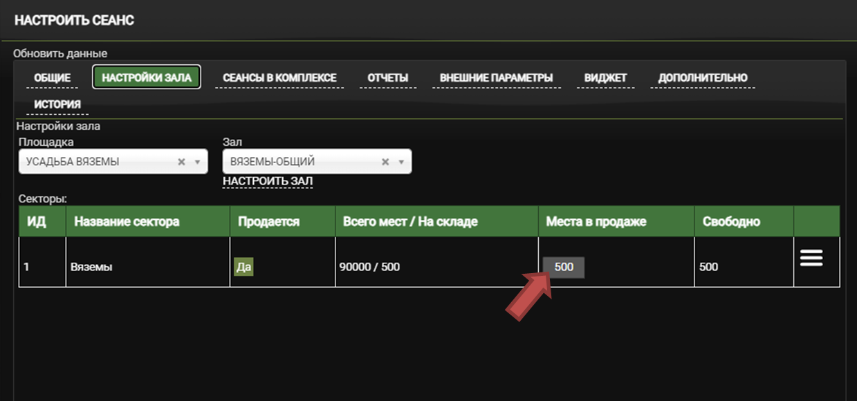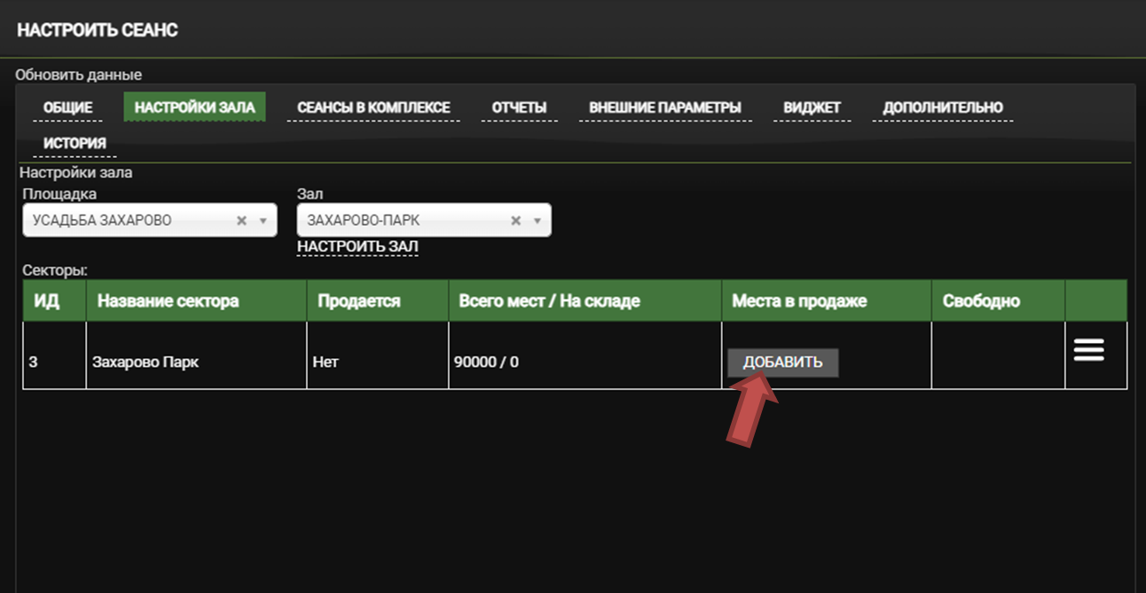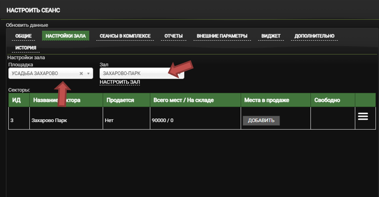 Вернитесь в «Настроить сеанс» - «Настройки зала» и установите новую «Площадку» и «Зал»