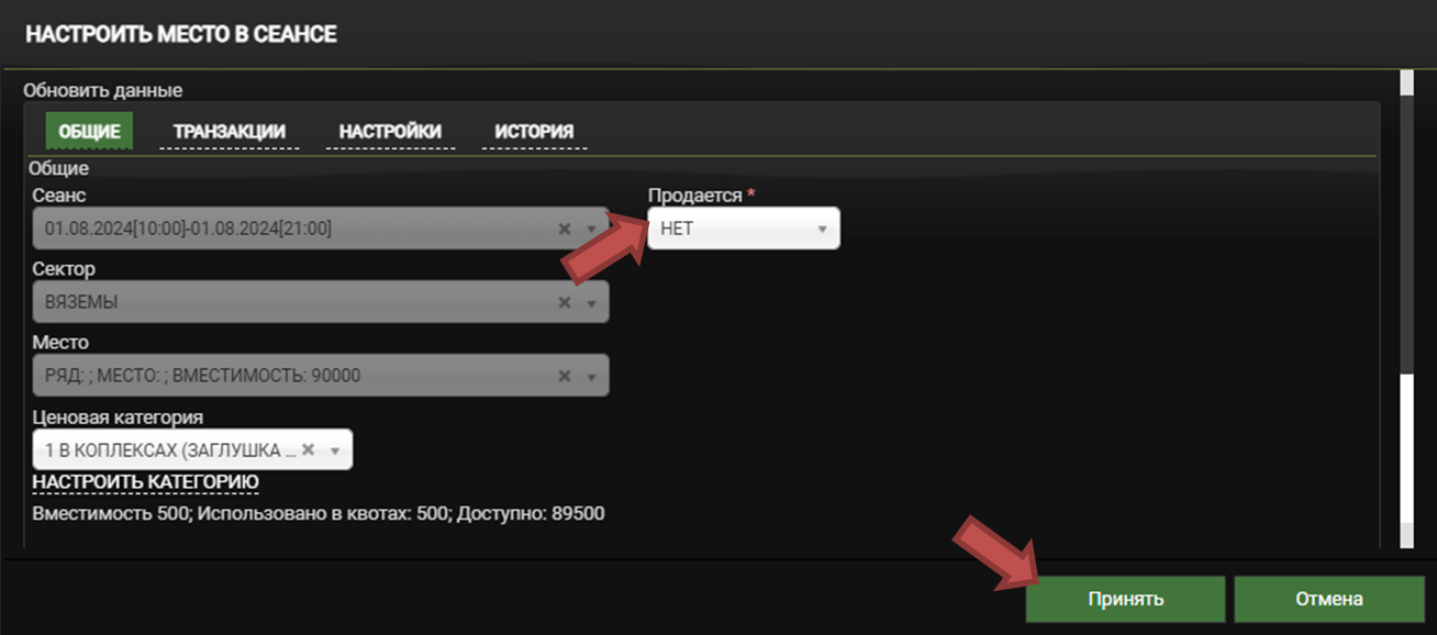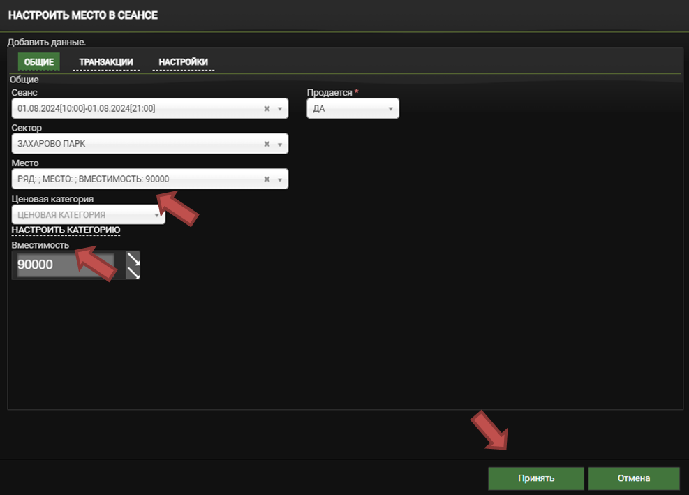 Укажите ценовую категорию и вместимость и нажмите кнопку «Принять»