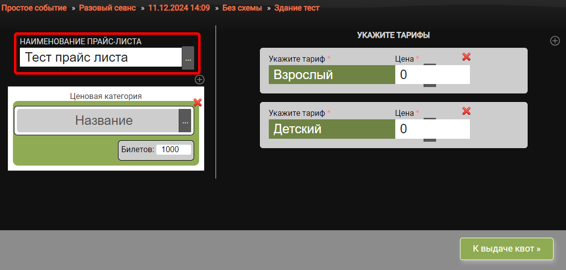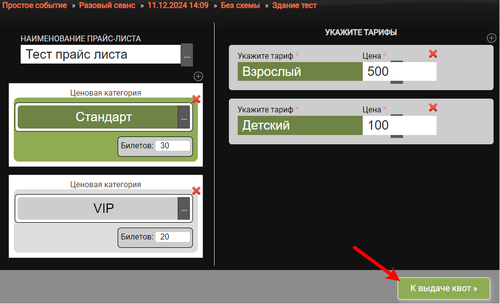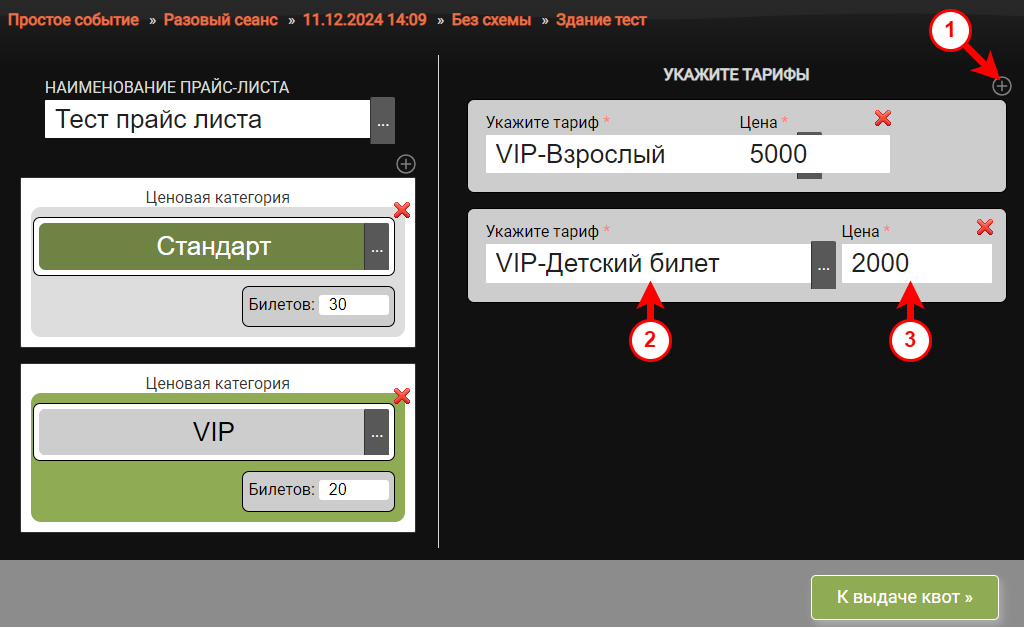 - Укажите тарифы для комплектов билетов (ценовых категорий)