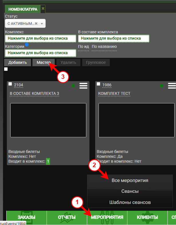 Так же мастер можно запустить на странице Номенклатура. Перейдите в раздел Мероприятия - Все мероприятия