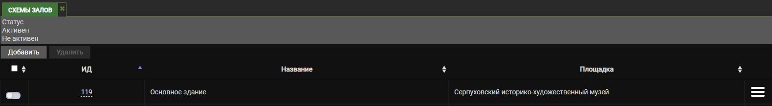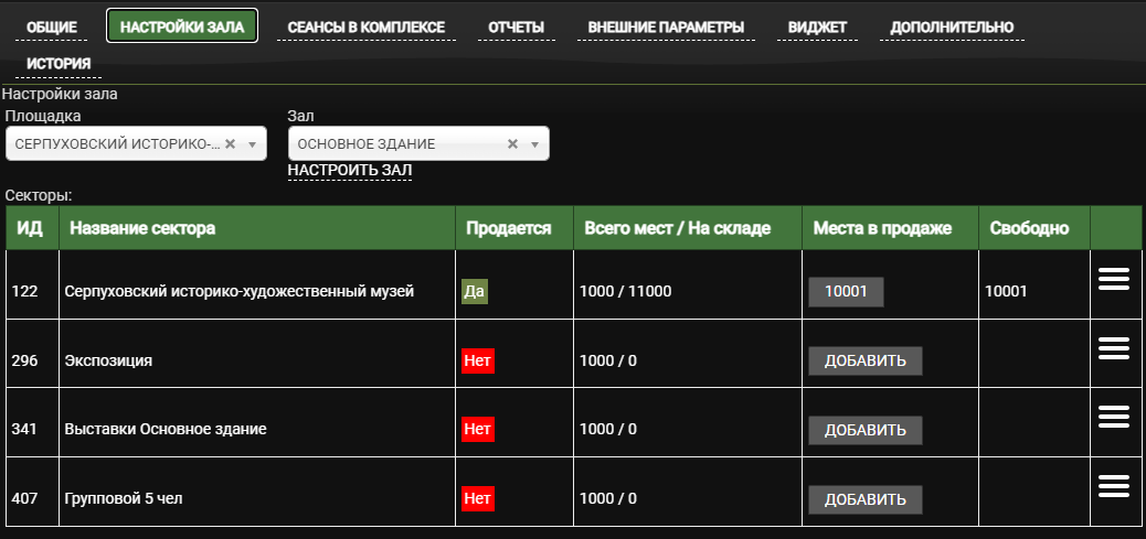Откройте зал в который нужно добавить групповой билет. Для этого кликните на числа в столбце ИД напротив нужного зала или нажмите на значок ≡, а затем на кнопку Настроить
