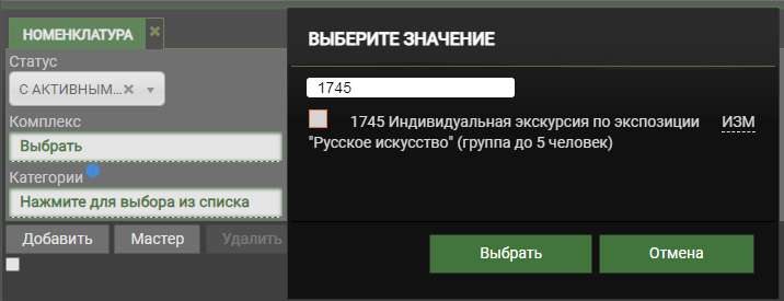 Нажмите на поле Комплекс, выберите нужное вам мероприятие и нажмите Выбрать