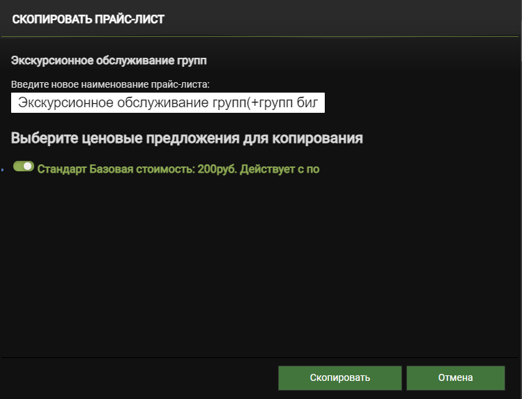 Введите Название нового прайс-листа и выберите ценовые предложения для копирования. Нажмите кнопку Скопировать