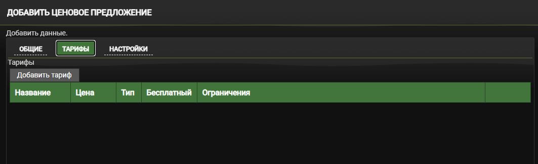 Перейдите на вкладку Тарифы и нажмите Добавить тариф