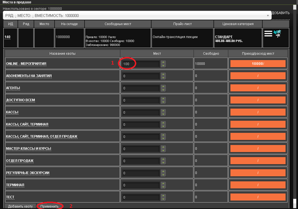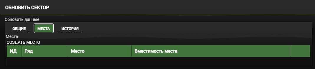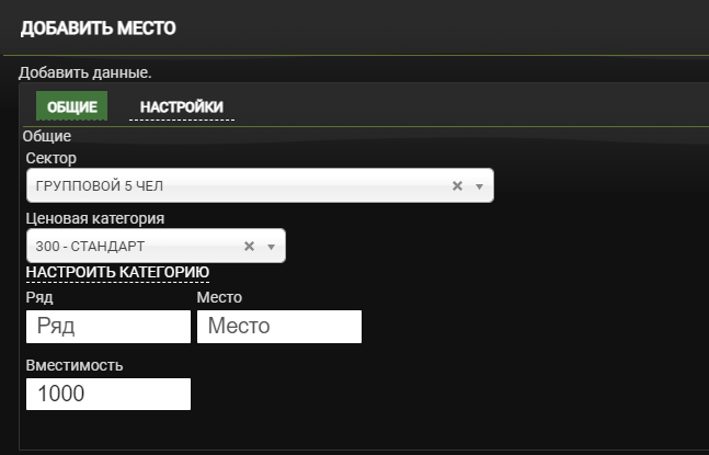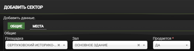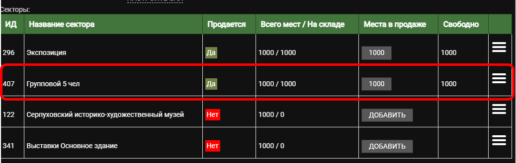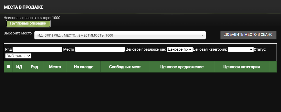 В колонке Места в продаже в строке группового сектора нажмите на кнопку Добавить