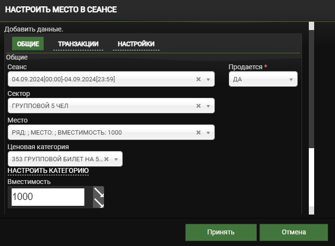 Укажите ценовую категорию и вместимость и нажмите Принять (ценовую категорию стоит устанавливать согласно прайс-листу, если вы групповой тариф выделили в новое ценовое предложение, то нужно указать его)
