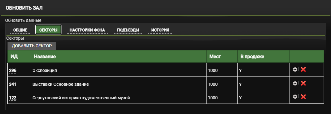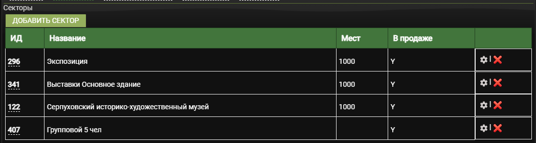 Откройте настройки созданного сектора. Для этого нажмите на его номер в столбце ИД или на значок ⚙️