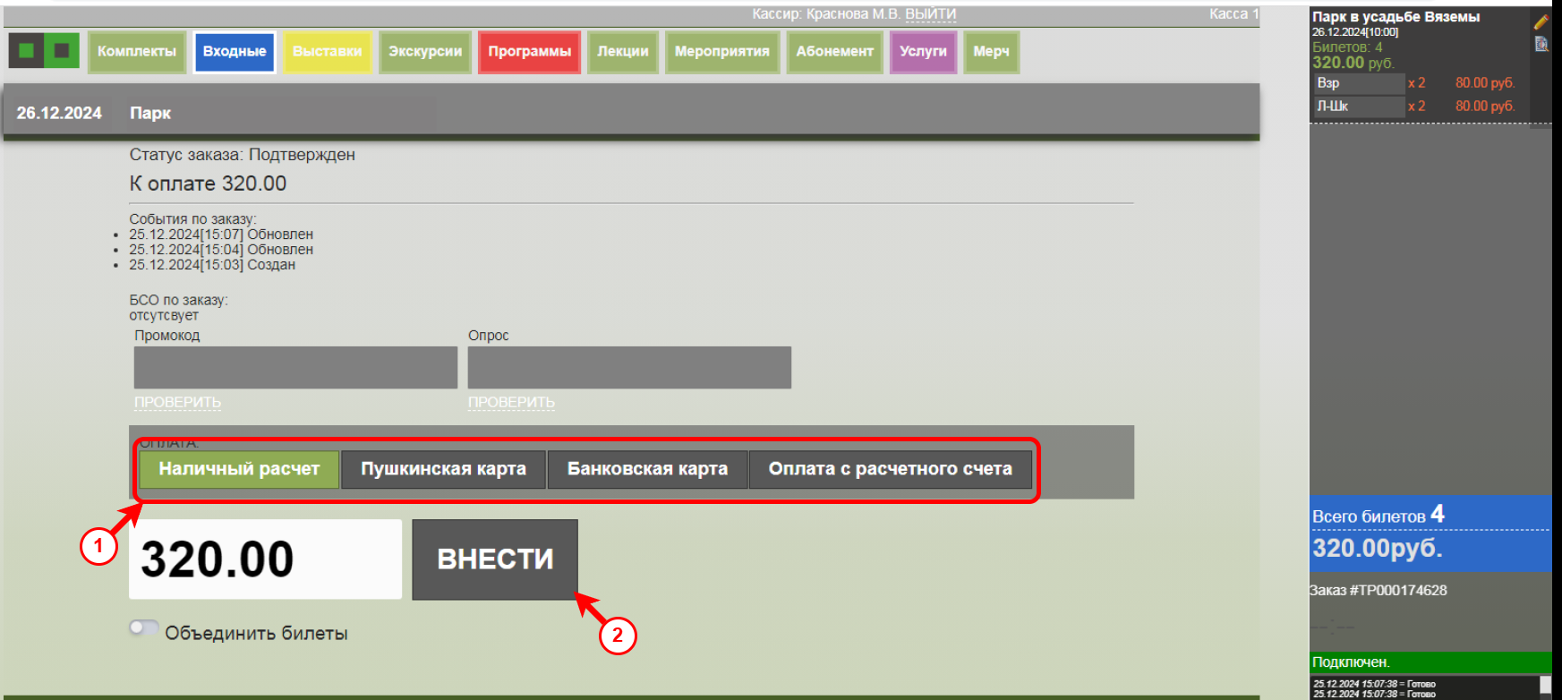 Укажите тип оплаты и нажмите ВНЕСТИ или ТЕРМИНАЛ