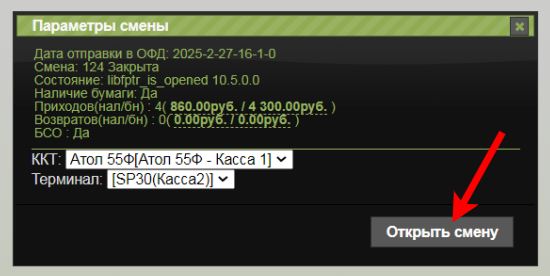 После авторизации всплывёт окно открытие смены. Нажмите Открыть смену