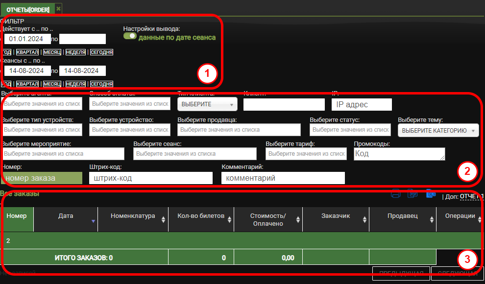 Переключатель настройки вывода “Данные по дате сеанса” – Включает режим вывода заказов по сеансам (При переключении отображается фильтр “Сеансы с … по …”