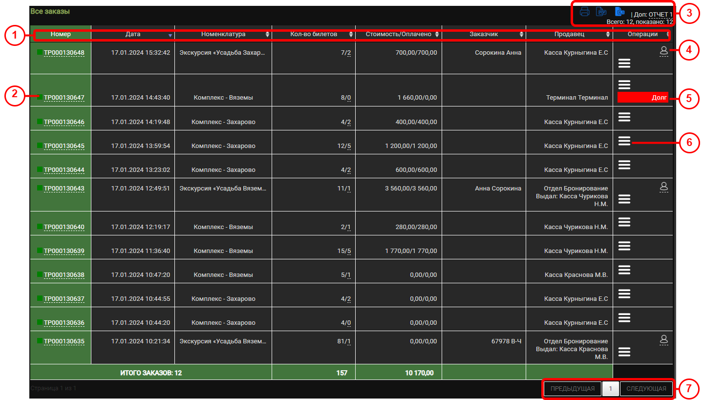 Столбец Продавец – данные пользователя оформившего заказ, если заказ оформил один пользователь, а билеты выдал другой, то будут указаны оба пользователя.