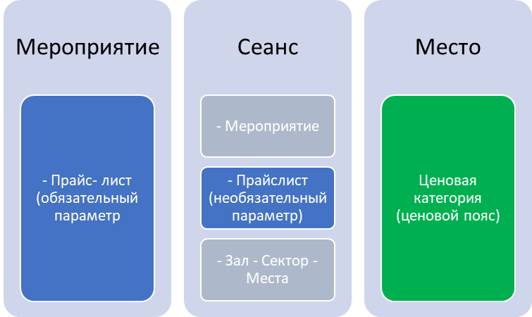 Для мероприятия мы обязательно указываем Прайс-лист, который может быть переопределен для конкретного сеанса. В схеме зала для каждого места задается Ценовая категория (ценовой пояс), который так же может быть уточнен для этого места в настройках сеанса.