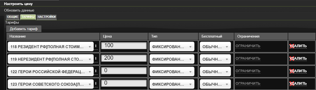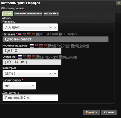 Тарифные группы – перечень категорий билетов. Обычно выделяют следующие тарифные группы: Стандартные (Взрослые, Детские), Льготные (Пенсионеры, Студенты).