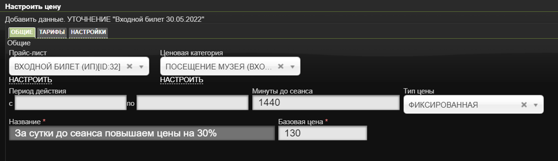 Можно указать или конкретную дату с которой будут действовать цены указанные в корректировке, или период в минутах до начала сеанса.