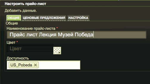 На вкладке «Общие» формы редактирования прайс-листов задается наименования Прайс-листа и область доступности (перечень площадок у которых будет доступ для использования данного прайс-листа ).