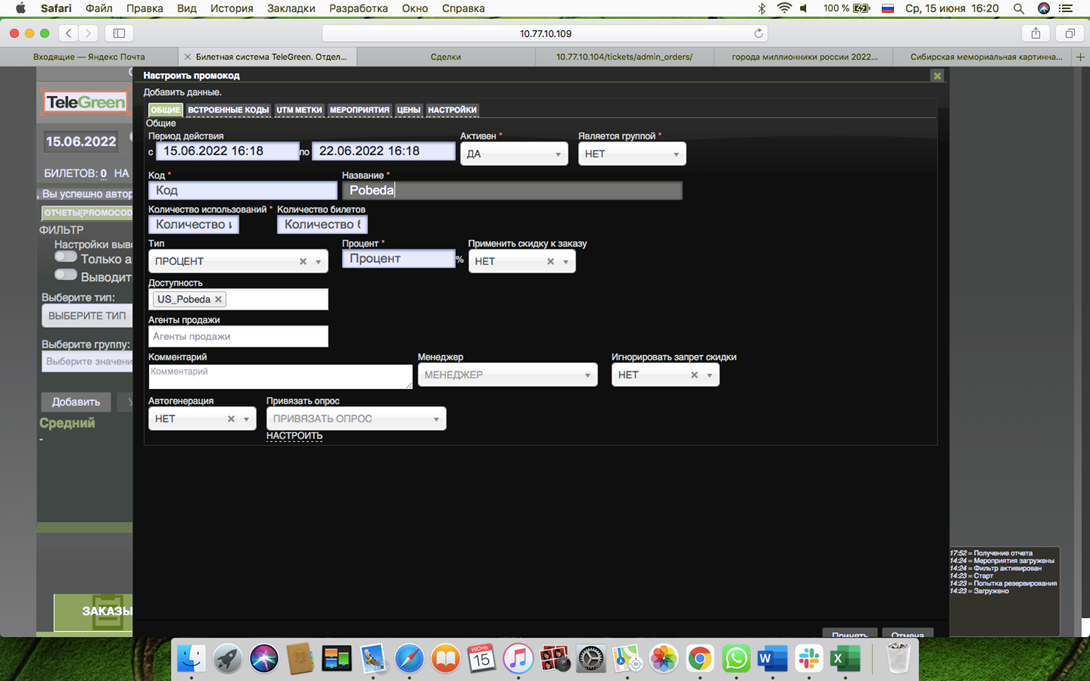Задаются разные параметры действия промокода на отдельно выбранное мероприятия.