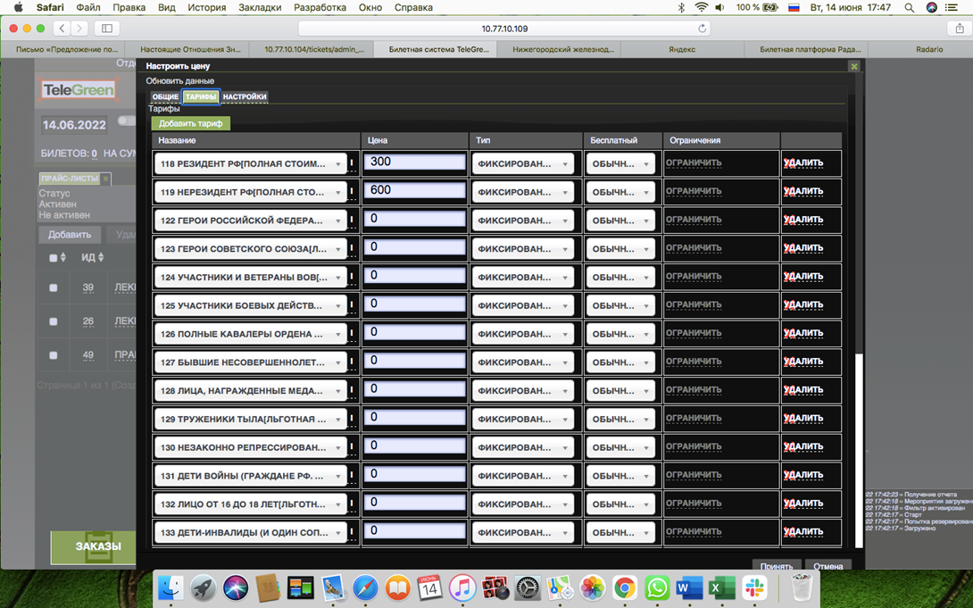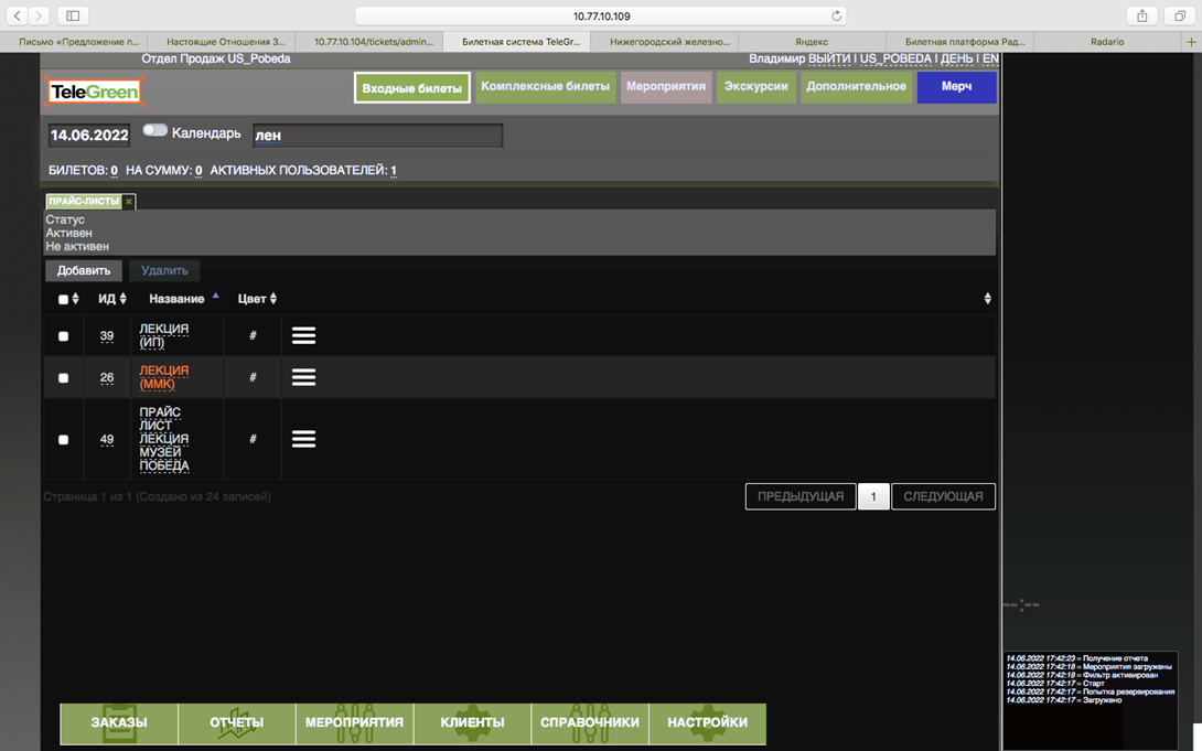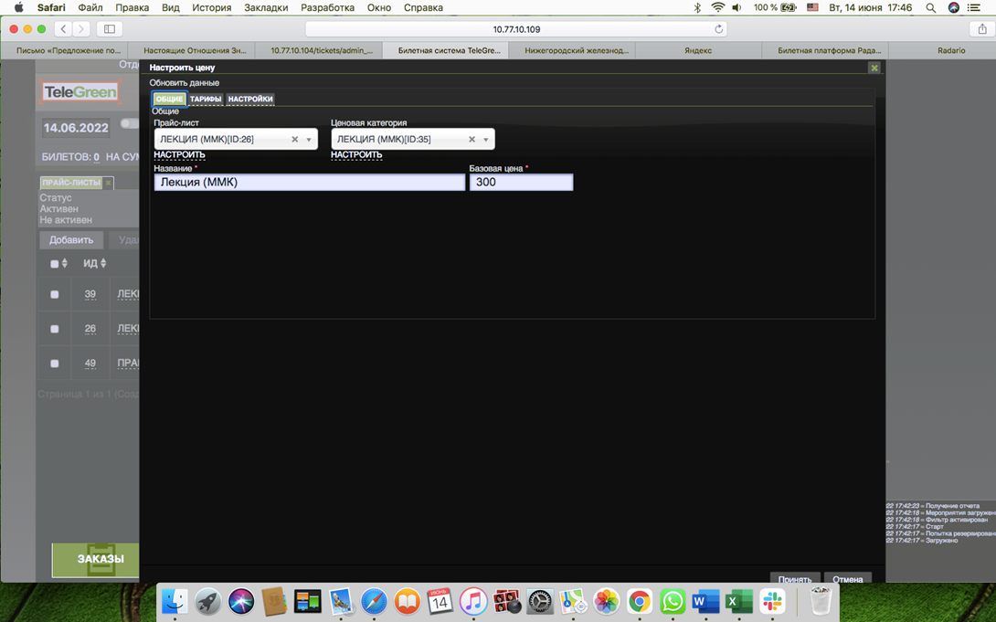 Изменение Цен в Тарифах (Добавление новых тарифов) Выбрать Прайс-Лист – Провалиться в название Выбрать вкладку тариф В данной вкладке, можно изменять цены существующих тарифов, либо добавить новые, необходимые тарифы. После выполнения необходимых операций, нажмите Принять.