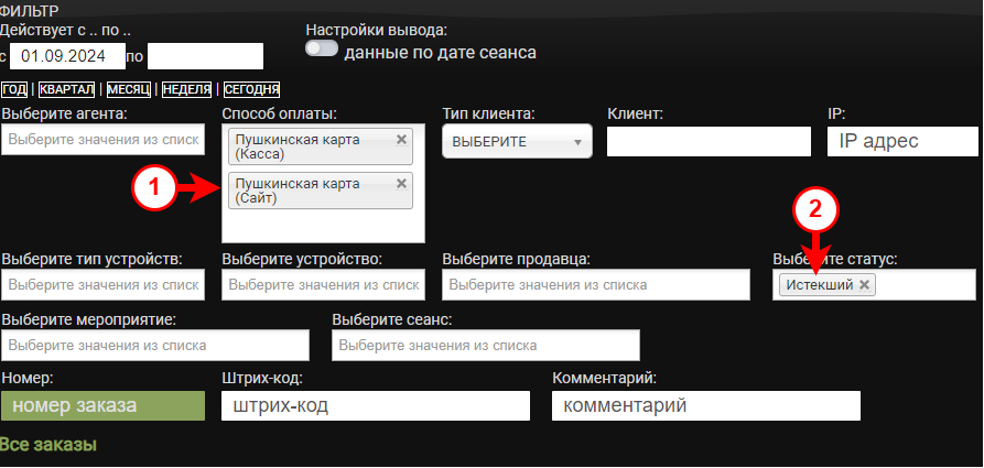 Выберите дату заказа и способ оплаты «Пушкинская карта». Если заказ был отменен и с его создания прошло более 30 минут, то выбирите статус Истёкший
