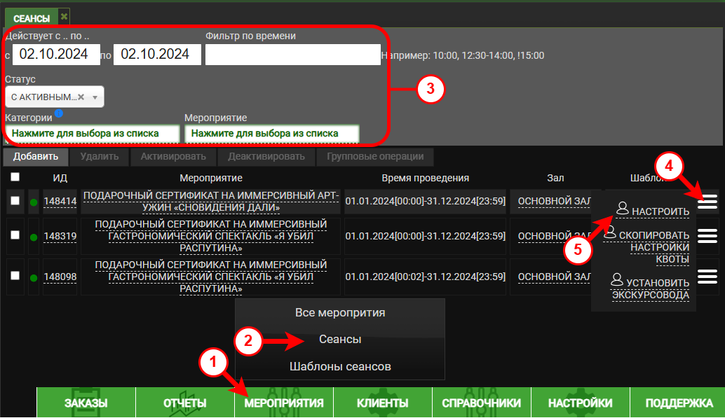 Откройте интересующий вас сеанс (Мероприятия - Сеансы или выберите сеанс через Продажи - Настроить сеанс)